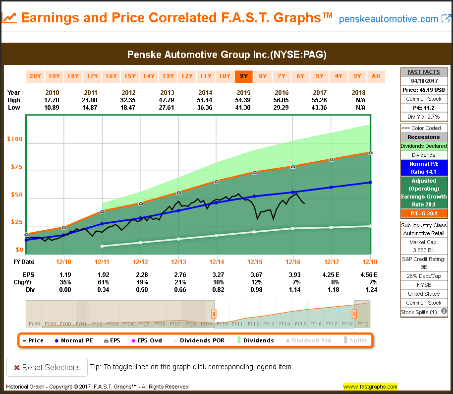 The reader should note that the market has historically tended to value this company within a P/E ratio range of approximately 13 to 14. Consequently, I consider a P/E ratio of 14 or below for this company as a sound and attractive valuation. Therefore, the current blended P/E ratio of 11.2 indicates that Penske is currently undervalued.