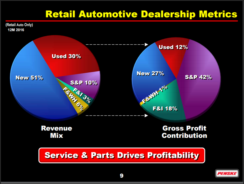 However, I found their revenue mix and profitability both balanced and interesting. As the slide below depicts, 51% of their revenue is derived from new auto sales, 30% from used auto sales and 10% from service and parts. But what I found more interesting was that 42% of their profitability came from service and parts. This struck me as a stable base for profitability because warranty work on new cars go through the dealership, and owners of premium vehicles tend to keep using the dealer for service after the warranty expires.