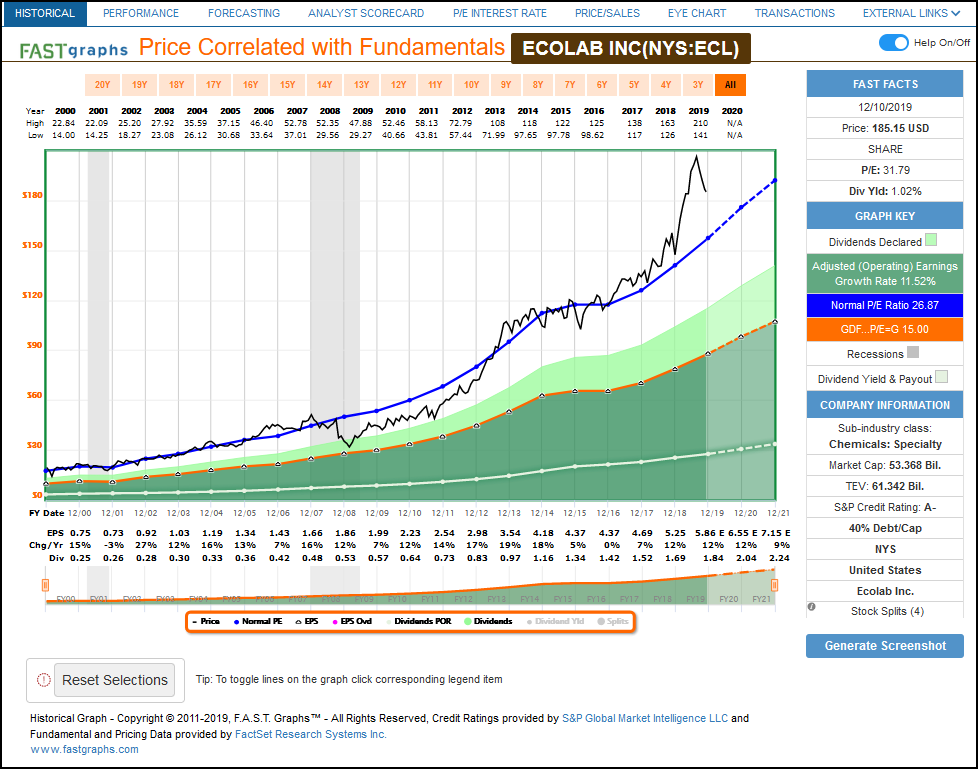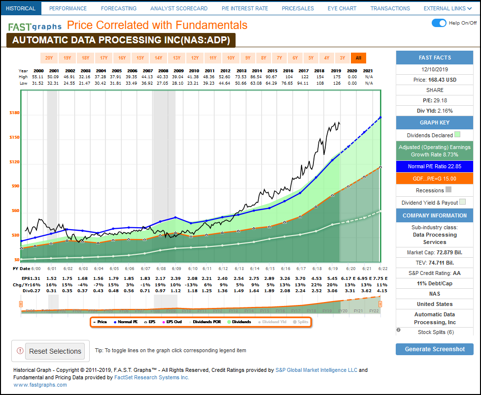 However, there are certain companies that will always command a premium valuation even when their earnings growth is within the 5 to 15% range. Echo Labs (ECL), Sysco (SYY) and Automatic Data Processing (ADP) are three examples as depicted in the long-term historical FAST Graphs below: