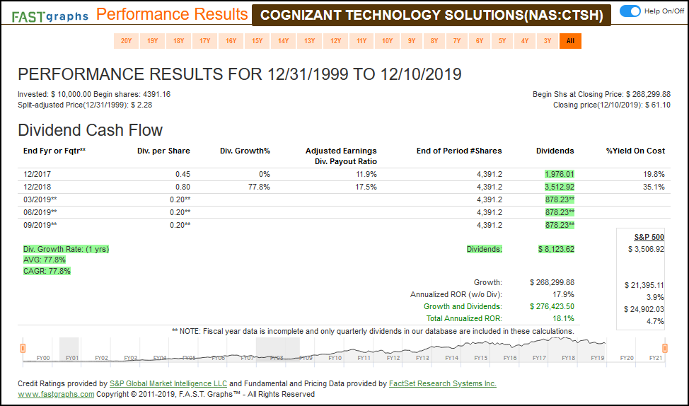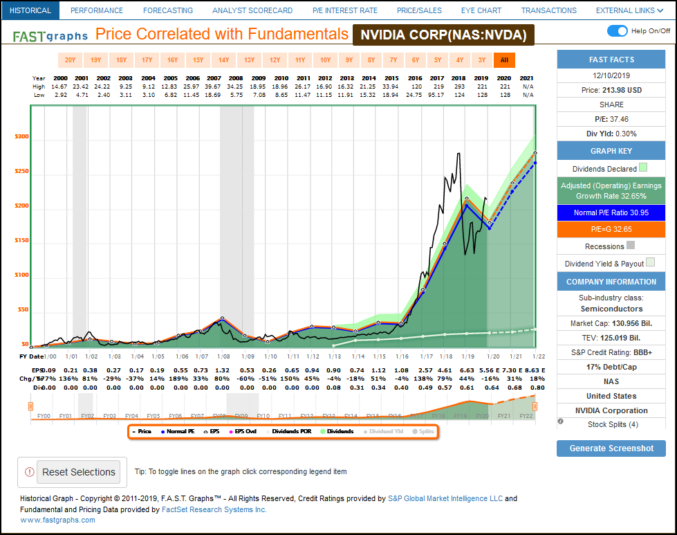 Dividends, if any, are represented by the light green shaded area above the orange earnings justified valuation line. Dividends are paid out of the green shaded earnings area, and are only stacked on top for visual perspective. One benefit this provides is the opportunity to see precisely when dividends are started. Keep in mind that companies that grow at this rate normally do not come with a high dividend yield. Performance graphs will accompany each earnings and price correlated historical FAST Graphs™.