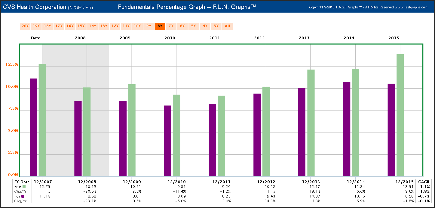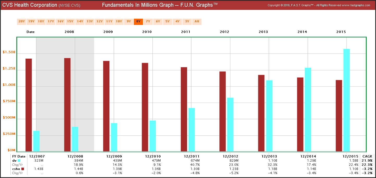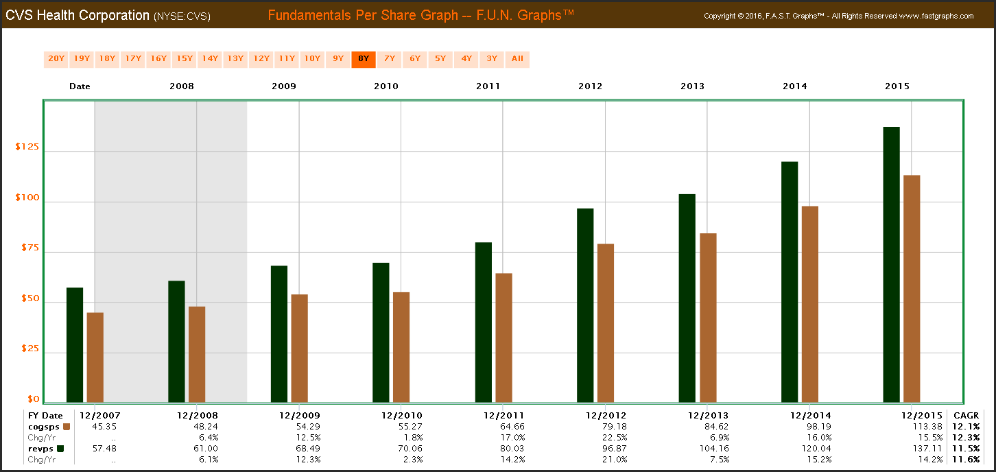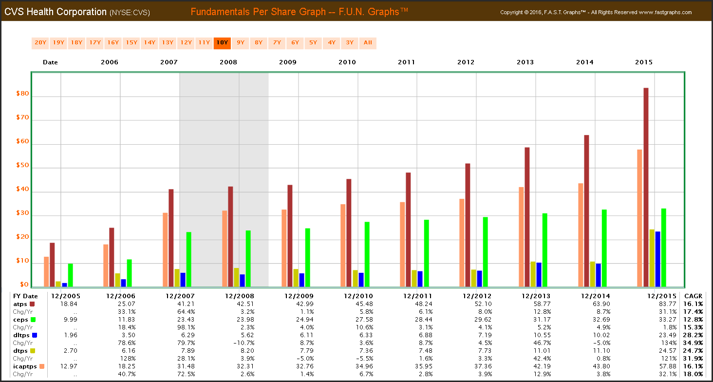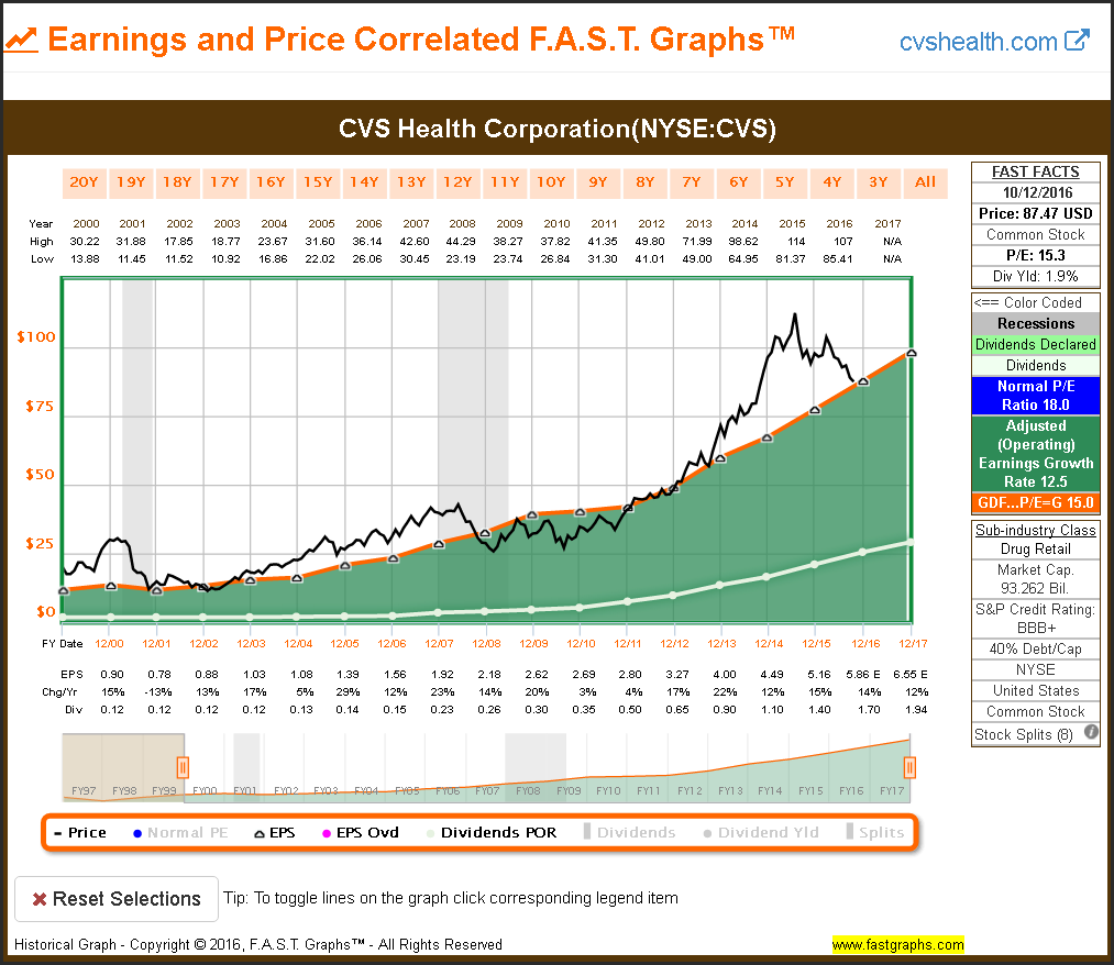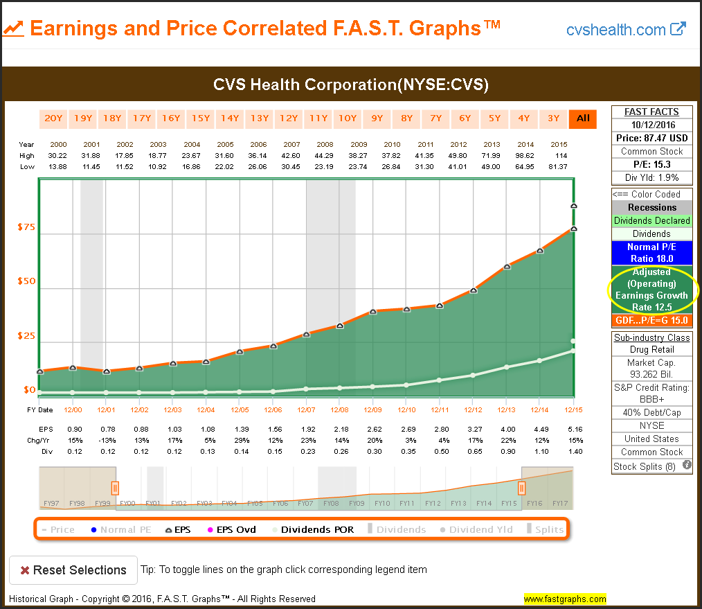 Before I delve into CVS Health Corporation’s valuation, I would like to establish why I consider it a great business from a shareholder’s perspective. For starters, I really admire the consistency of operating results that the company has generated. The following F.A.S.T. Graph plots the company’s earnings and dividends since 2000 through 2015. Note that I chose this timeframe because it includes both of our most recent recessions. It is very rare to find a company that has so consistently grown its earnings and dividends over time. Moreover, in addition to consistent growth, CVS’s growth rate has also been significantly above average.