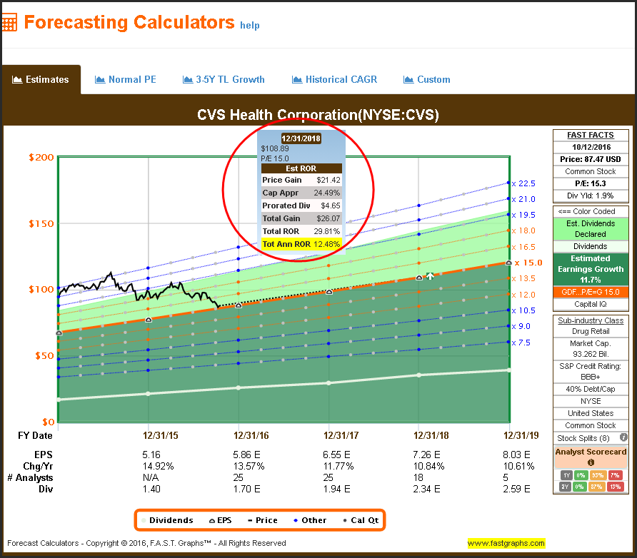 The consensus of 25 analysts reporting to S&P Capital IQ expect CVS to grow earnings by 13.57% for this fiscal year end followed by an 11.77% for fiscal year ending December 31, 2017, and 18 analysts expect earnings to grow 10.84% for fiscal year-end December 31, 2018. If these analysts are correct, that would suggest double-digit rates of return over the next couple of years. Additionally, these analysts’ earnings estimates are consistent with CVS management’s guidance range for adjusted earnings of $5.81 to $5.89 for this fiscal year end.