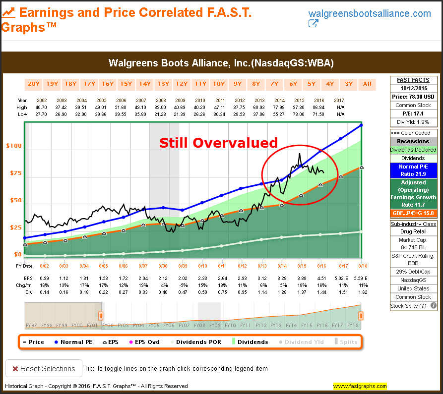 On the other hand, Zacks also points out CVS’s vulnerability to federal and state reimbursement laws due to their high dependence on Medicare, Medicaid and other government-sponsored health programs. They also address the potential competitive threat from the Walgreens Boots Alliance and Rite Aid pending merger. However, that merger is currently facing FTC scrutiny. Personally, I believe that there is room for both powerhouses to flourish in the future. Moreover, although I consider both WBA and CVS to be excellent businesses, I currently favor CVS based on a more attractive current valuation. For perspective, here is the earnings and price correlated F.A.S.T. Graph on WBA:
