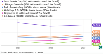 Truist Financial has the largest net interest income growth rate of 16.98% in the past three years, outpacing all the other banks in comparison by a mile, even against the mighty JPM.