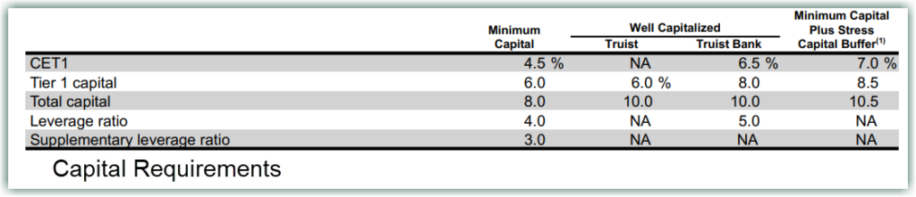 The Federal Reserve’s capital framework for banks with $100 billion or greater in total consolidated assets is partly determined by the supervisory stress test results. The table below shows the total common equity tier 1 (CET1) capital requirement for Truist, which is made up of several components, including