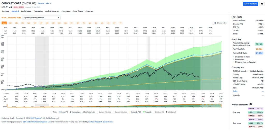 Analysts expect modest revenue growth of 2–3% and EPS growth of 4–5% through 2028. Morningstar rates Comcast 5 stars, estimating fair value near $49 versus a current price around $31. Depending on valuation assumptions, fair value estimates range from $48–$73 per share. Even at conservative multiples, FAST Graphs shows potential double-digit annualized returns over the long run.