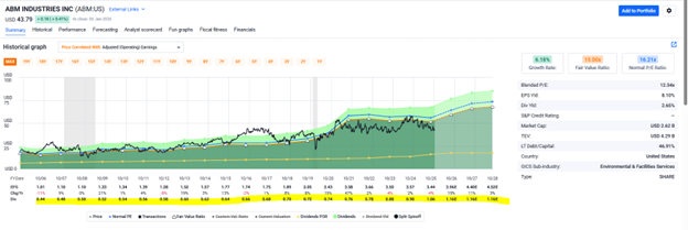 When viewed on a FAST Graph, the dividend is represented by the gold line. What immediately stands out is the steady and predictable nature of that line. Year after year, ABM has increased its dividend, offering shareholders a growing income stream supported by earnings growth.