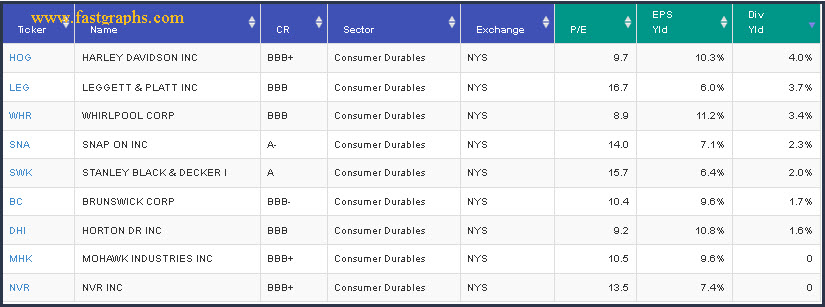 Finally, I suggest that the reader further note that these are not necessarily great dividend opportunities. Two of the companies covered in this article do not pay a dividend and some that do have a pretty spotty record which includes significant dividend cuts. However, Leggett & Platt and Stanley Black & Decker are Standard & Poor’s Dividend Aristocrats and Snap-On Inc. is a Dividend Challenger. Nevertheless, I believe that investors need to pick and choose making sure that any of these prospective research candidates are compatible with their goals and objectives.