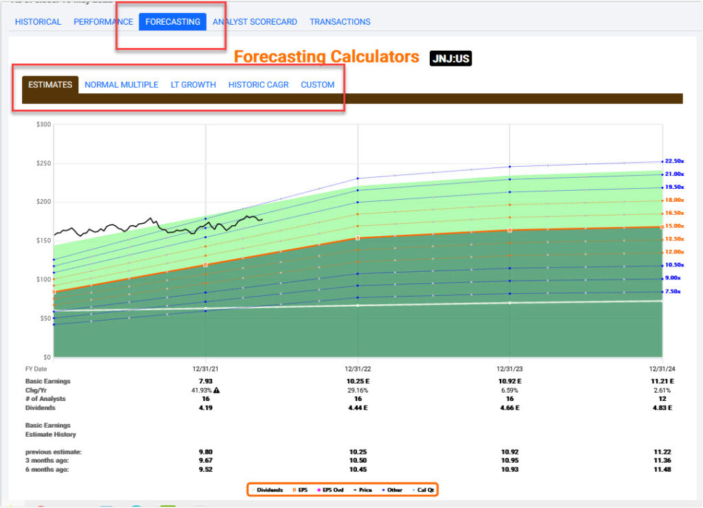 The FAST Graphs, fundamentals analyzer software tool, provides subscribers numerous forecasting capabilities via our “Forecasting” section. There are three separate forecasting options as well as a fourth custom option that subscribers can utilize to create “what if” forecasting scenarios. With this video we will explain the many features of our “Forecasting” suite as well as how to properly utilize and interpret them.