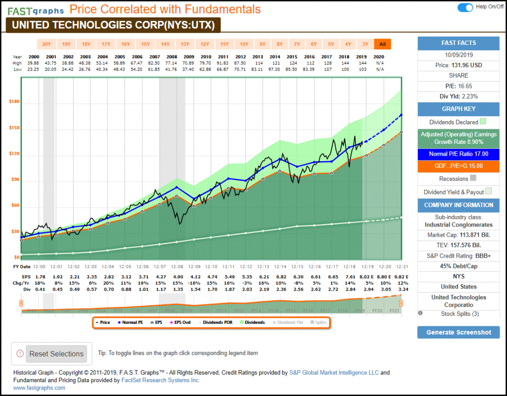 In the case of United Technologies, you can see from the graphic below that the company has grown earnings at 8.9% per annum since calendar and fiscal year 2000. Furthermore, you also note that earnings growth is what I would call quasi-cyclical with occasional periods of flattening or slight drops. On the other hand, the dividend record is very consistent (the white line on the graph). You might also note that the stock was slightly overvalued at the beginning of this timeframe, but only slightly.