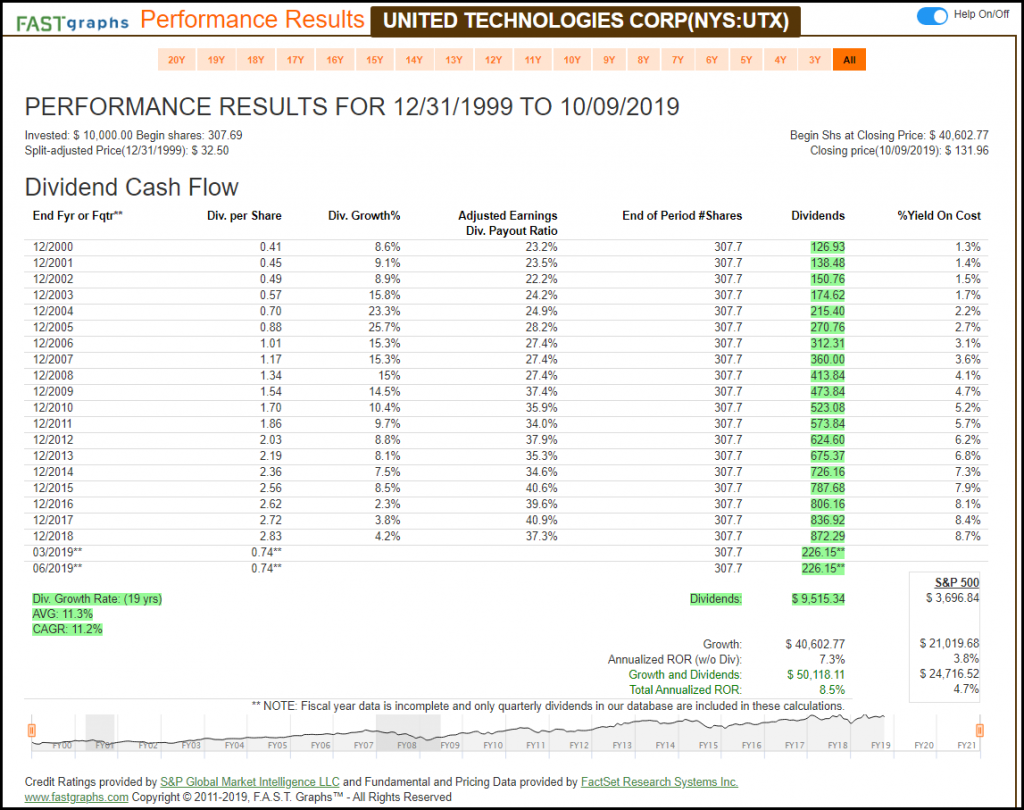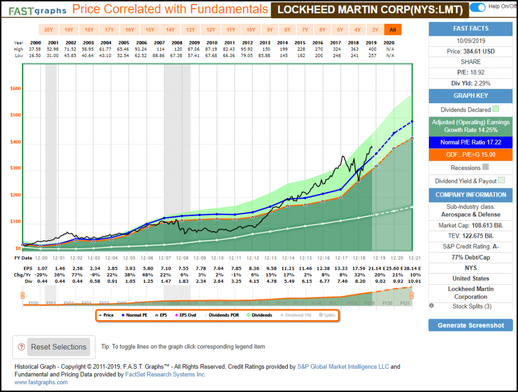 In contrast to United Technologies’ moderate growth achievement, Lockheed Martin has grown earnings at over 14% per annum since 2000. Additionally, Lockheed Martin also has a very consistent record of dividend growth (the white line on the graph).