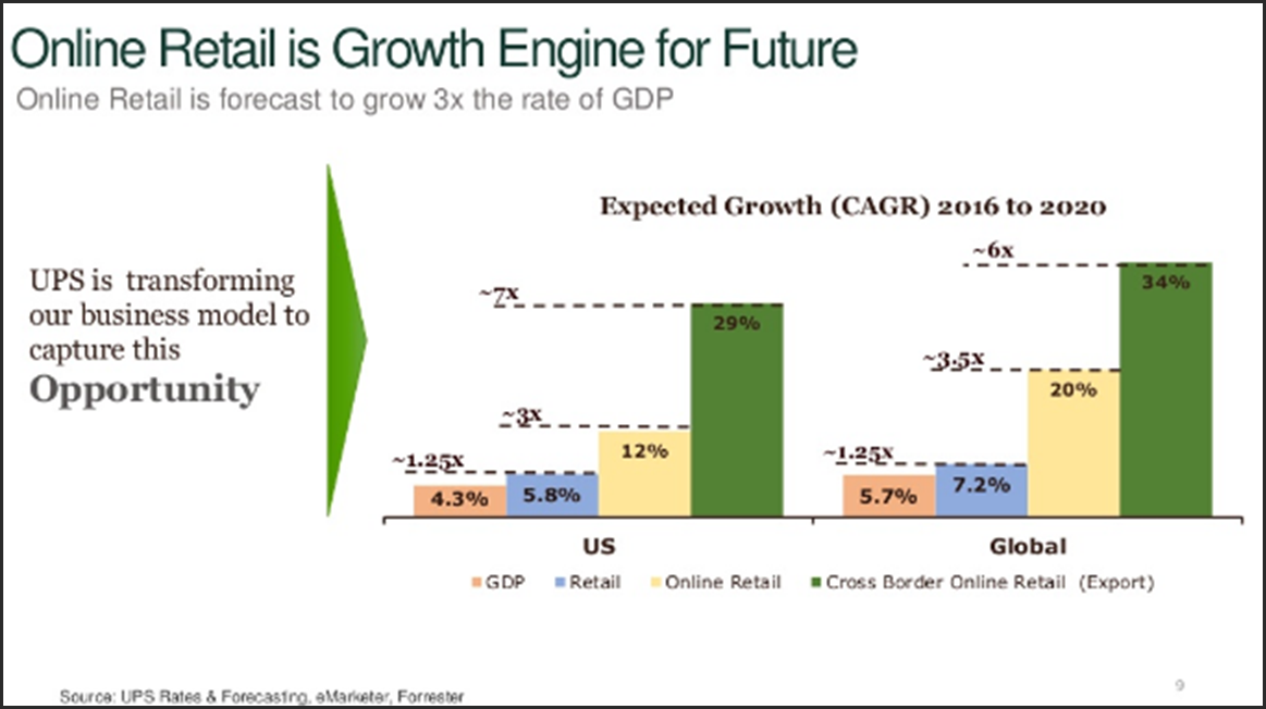Part of the reason I bring this up is because there are many investors that are concerned that Amazon may be a disruptor longer-term. However, I believe those concerns are overblown. Amazon may develop their own internal distribution network, but I do not believe they are willing or capable of duplicating UPS’s massive worldwide distribution network and infrastructure. Moreover, there are thousands of large businesses and millions of small ones that will continue to utilize UPS and its competitors. More importantly, UPS believes that online retail is the growth engine of the future and they are transforming their business model to capture their fair share this opportunity as indicated below: