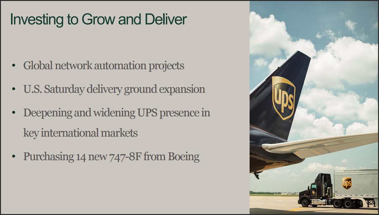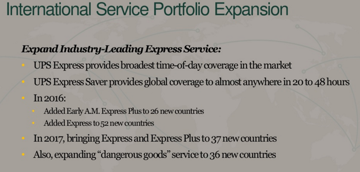 In addition to what’s been mentioned so far, UPS is also expanding their international footprint. UPS is already truly a global powerhouse in the worldwide package delivery business and they are expanding as evidenced by the following slide from their recent presentation:
