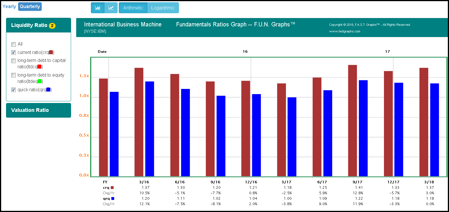 Will IBM, or can IBM be successful with its current initiatives? Clearly the jury is still out. However, there are bright spots. Nevertheless, since my objective for investing in IBM is income and safety, their future growth is less important to me than the sustainability of their business. A quick glance at IBM’s acceptable current ratio of 1.37 and quick ratio of 1.18 suggests that there is little worry that IBM will not remain an ongoing concern: