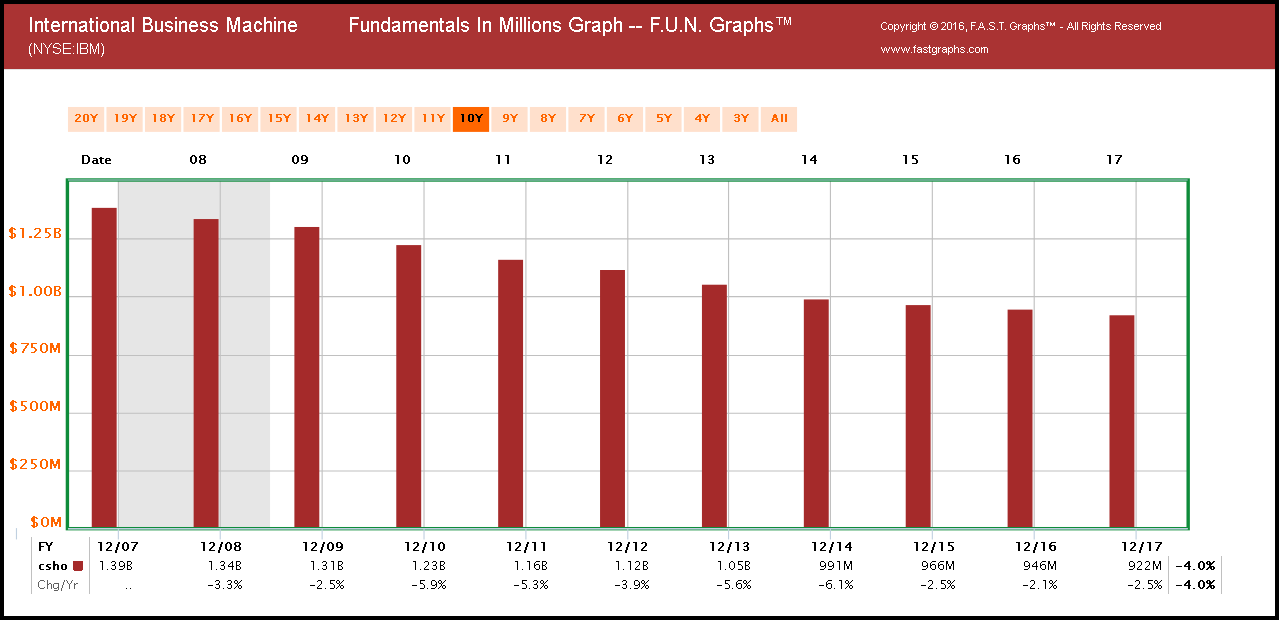 Additionally, I would like to add that I am generally neither for nor against a company repurchasing its shares. More specifically, I am in favor of a company repurchasing their shares when their valuation is low – as IBM’s has been for the past 10 years. Conversely, I am against a company purchasing their shares when their valuation is high. Stated more simply, I only like to see a company buying their shares when I would also personally be willing to invest in those shares. In other words, I consider buybacks prudent and attractive when a company’s valuation is low, and I consider it reckless behavior if a company is buying their stock when their valuation is high.