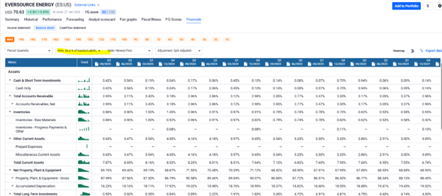 When analyzing a balance sheet through FASTGraphs, each asset, liability, and equity item is expressed as a percentage of total assets. This provides clear insight into capital allocation and overall financial structure.