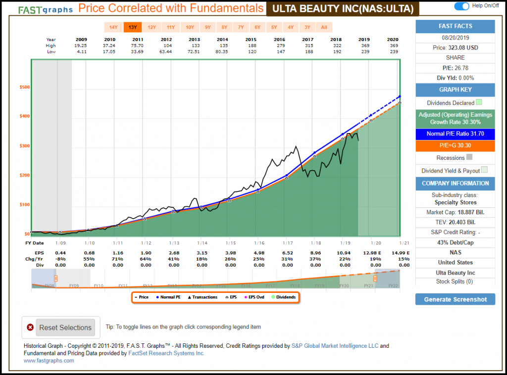 When reviewing the following screenshots, I ask that you pay close attention to a couple of important attributes. First start your review by checking the dark green color-coded rectangle to the right of each graph that shows the company’s earnings growth rate over the timeframe being shown. Next, check the orange rectangle and note the P/E ratio that is being applied and the widely accepted formula for valuing a business that is utilized. Then, as you review each company, focus on how the stock price (the black line) has correlated to and followed the orange earnings justified valuation reference line. Finally, note how these valuation reference lines have actually provided fair valuation insights historically in the real world.